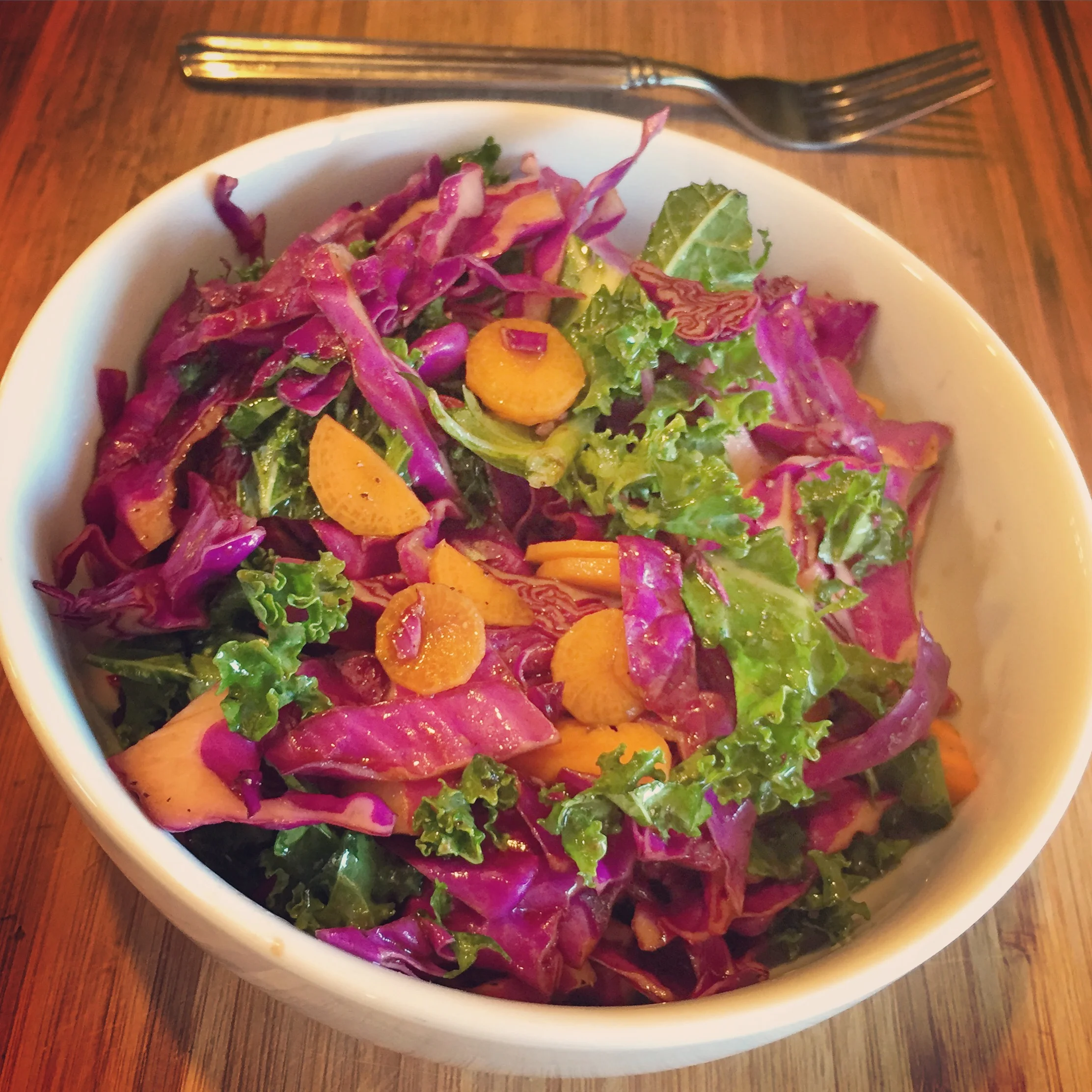 So I whipped up this simple Rainbow Salad. Kale and red cabbage make it hearty. The crispness brings the “fresh”. And the simple dressing makes it easy and yum!
